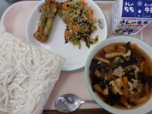 地粉うどん、肉南蛮、竹輪の鶴茶揚げ、小松菜とツナのソテー、牛乳です。