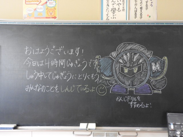 おはようございます! 昨日は、雷雨対応(下校見守り)ありがとうございました。 保護者&地域の皆様の「ワンチーム鶴二小!」のおかげで、子どもたちの安全が守られていますこと、心より感謝申し上げます。 今朝は、昨日よりも気温が低くて、過ごしやすいかな? と思いながら、校長のモーニングルーティーンワークをこなしましたが、全身、汗びっしょりになりました。 校舎の中が予想以上に室温と湿度が高く、どんぐり公園側の窓を開けると、冷たい空気が、校舎の中に流れ込んできました。 初任者の先生が、毎日、子どもたちのために書いている黒板メッセージ。これまで、一度も同じ絵だったことはありません。(本当にすごいなぁ。校長にはまねできないなぁと毎日、感心しています。) 校務員さんが、今日も児童昇降口をきれいにお掃除してくださっています。 鶴二小の校庭では、地域の方々が、点検を行いながらお散歩してくださっています。 今日も「すべては子どもたちのために」を合言葉に一緒にがんばりましょう! 登校見守りへ行ってきます。 気持ちの良いあいさつを心掛けます。