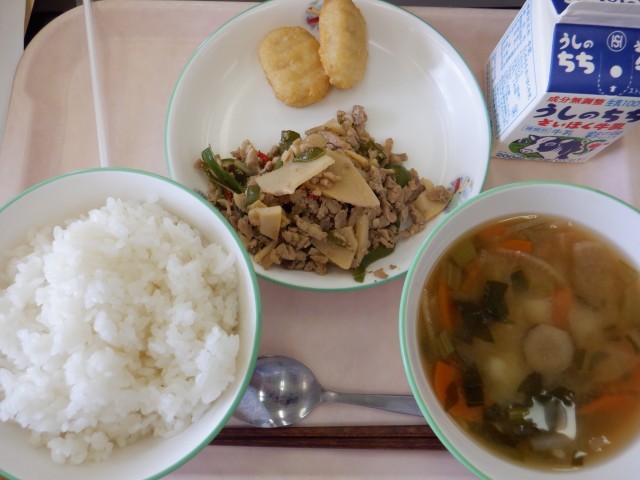 「ごはん、牛乳、根菜のみそ汁、チキンナゲット(焼)、豚肉とピーマンの炒め物」です。