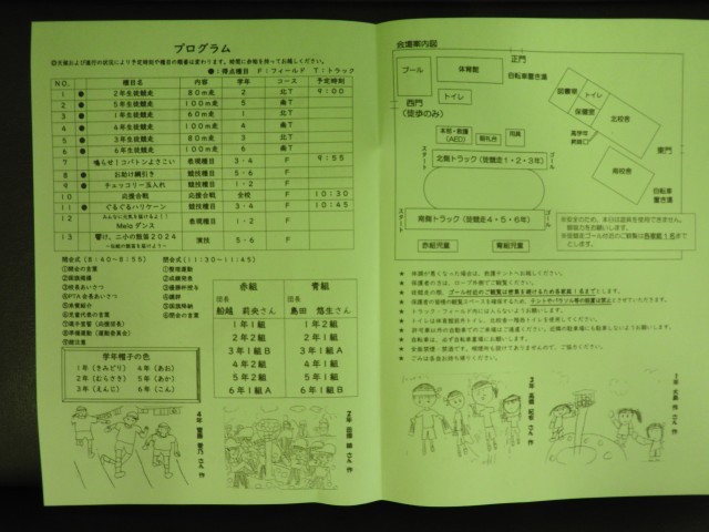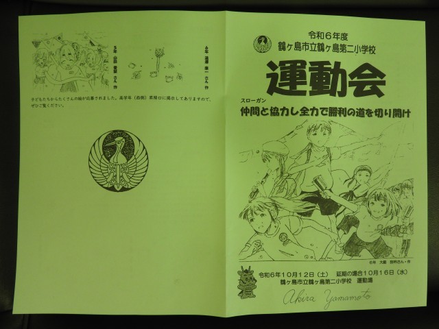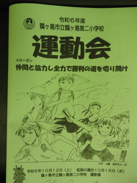 鶴二小ホームページが始まって以来、合計ホームページ更新数が、8,000件に到達しました。 鶴二小の運動会のプログラムを紹介します。 今年の運動会のスローガンは、「仲間と協力し全力で勝利の道を切り開け」です。 6年生の力作の絵が表紙を飾っています。 鶴二小運動会は、10月12日(土)午前8時40分から始まります。(午前中のみの開催です。) 保護者&地域の皆さん、ふるって応援お願いします!