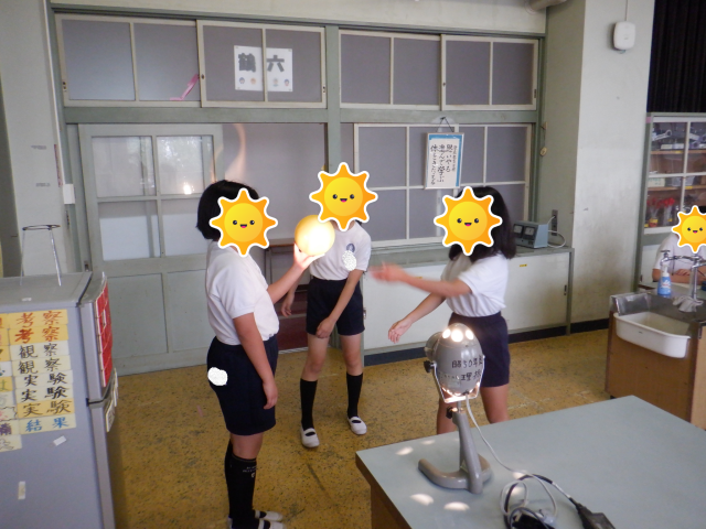タブレットによる映像資料から探る子供や、用意しておいた光源装置(何と昭和50年の表示)とボールを使って確かめる子供たち。