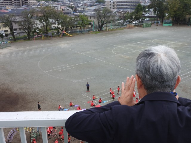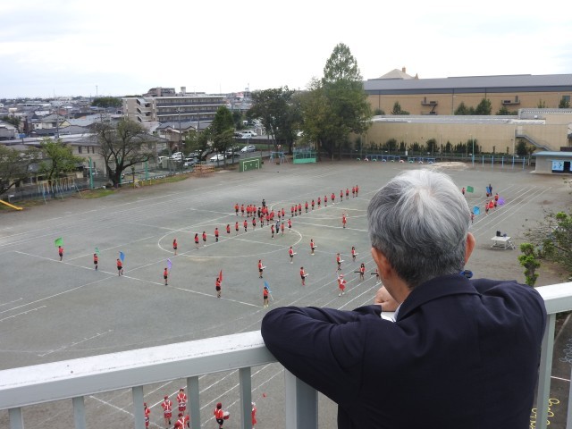 北校舎の屋上から、もと教務主任の先生(教育委員会の先生です。)と一緒に、高学年の子どもたちの鼓笛練習を見守ります。 練習を終えて、休憩時間になると子どもたちが、屋上にいる私たちの存在に気づき、手を振ってくれました。 「N先生! こんにちは! 私たち、成長しましたか?」 「こんにちは! もちろん、カッコイイよ! 本番、がんばってね。」 人と人の「絆」の強さを感じました。