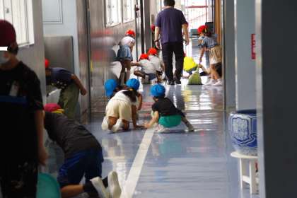 二小ではたてわりで掃除をしている場所があります。職員室前から南校舎への出入り口にかけての掃除の様子です。奥側では、2年生(赤帽子)が一生懸命に掃除をしています。手前側は6年生(エンジ帽子)と1年生(青帽子)が一緒になって掃除をしています。6年生が「ここをもっと拭いて」や「しゃべりながら掃除をしちゃダメだよ」などと的確な指示を出してくれます。1年生も6年生の指示に従って、黙々と雑巾を動かします。いつもきれいな二小の校舎内ですが、その陰には、こういった地道な取組があります。