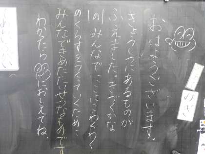 8日の1年生の教室の黒板の答えは、じゃか、じゃ〜ん。 クラス目標の掲示物だそうです。 子どもたち自身の似顔絵の中に、担任の先生も入っています。 見つけられるでしょうか? 温かく優しい癒しのエネルギーが掲示物から出ているような気がします。