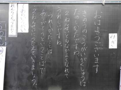 おはようございます。  本当にあっという間の一週間でしたね。 毎日、鶴二小のホームページにお付き合いくださり誠にありがとうございます。 最近、授業風景の更新が少ないのは、子どもたちが「硬筆」に集中している時間があったり、お客様や出張が重なっていたりしたからです。 私はいたって健康ですのでご安心ください。 出張で校長室をあけると、帰校後に、子どもたちが「校長先生大丈夫?」と校長室をのぞきこんでくれます。 あ鶴二小名物「元気でさわやかなあいさつ」と「真心こめて感謝のありがとう」。子どもたちと共に私も大切にしていきます。 本と音楽とおいしい飲み物でほっこり時間を。 いってらっしゃい。 カフェに飾ってあるような生徒の作品に癒されます。