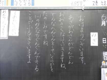 おはようございます。 窓を開けると、さわやかな空気が校舎の中を流れてゆきます。 先週、出張で他市の小学校へいきました。ちょうど、子どもたちが下校する時刻で、「さようなら。」とあいさつを交わしました。 その学校の子どもたちのあいさつも、鶴二小の子どもたちのように元気でさわやかでした。 隣のクラスに元気にさわやかにあいさつ。週のスタートが気持ちよく始まりますね。 あさがおと一緒に子どもたちもすくすくと健やかに育っています。 「全ては子どもたちのために」今週も一緒にがんばりましょう。 いってらっしゃい。