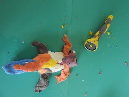 カラーねん土と磁石(じしゃく)を使って、合体? する作品を作っているようです。 自分がもしこの2つの材料を渡されたら何を作るだろう? と考えながら、子どもたちの作品を鑑賞していきます。 子どもたちの発想力と手の創造力のすばらしさに、時間の流れをついつい忘れてしまいます。
