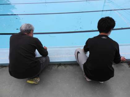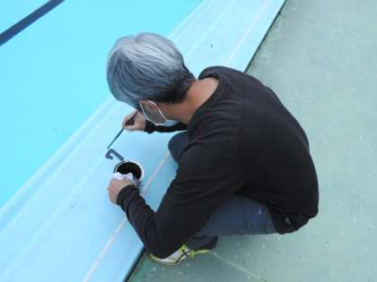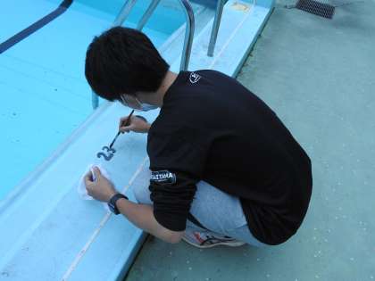 放課後の体育館から、地域の「剣道」団体の子どもたちが練習する竹刀(しない)の音が響いてきました。練習を見学させていただきながら、指導者や保護者の方々と「私も、何か○○【道】を究めてみたいです。」とお話したら、「剣道をどうぞ。」とすすめられました。 帰宅しようとすると、プールの方から何やらあやしい声が聞こえてきました。耳を澄ますと「1〜」、「2〜」……。いや〜ん。もしかして、学校あるあるプールの……。「鶴二小一歩前へ!」と勇気をふるいおこしながら、おそるおそるプールサイドに行くと、体育主任の先生と教務主任の先生が、ペンキでプールのふちに数字を書いていました。 子どもたちや先生方が、泳力の練習や検査をするときに、速やかに正確に距離が分かるように、数字を書いているとのこと。 子どもたちのために、先生方のために、感謝です。