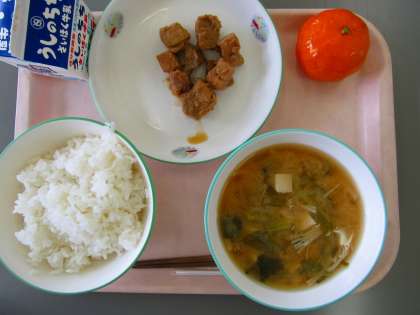 ごはん、牛乳、豆腐とえのきの味噌汁、豚肉の甘辛煮、冷凍みかん です。