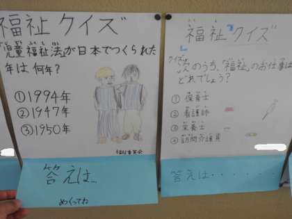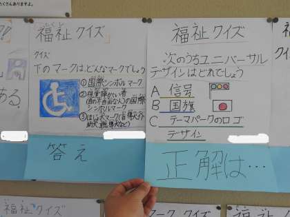 職員室の廊下の福祉委員会の掲示板にまたまた新しい掲示物がはられていることに気づきました。 クイズ形式になっていて、福祉に関する知識を学ぶ仕組みになっているようです。 世の中には知っているようで、知らないことがたくさんあることを、改めて実感しました。 福祉委員さんに教えてもらったことを、町の中で探してみようと思います。