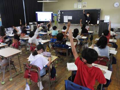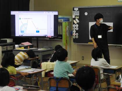 業前運動のときに、子どもたちと全力で追いかけっこをする実習生。 算数の実習授業にのぞむ実習生。 分度器を使って、角度をはかる授業です。 まず、はかる角度の図を観察し、角度の大きさの予想を立てます。次に実際に、分度器を使って角度をはかり結果を出します。 「予想した角度の大きさ」と「結果の角度の大きさ」の関係はどうだったかな? 子どもたちも教育実習生の先生が大好き。一生懸命授業にのぞみます。 なんだか、温かいですね。