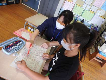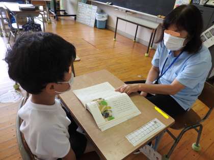 女の子がかけ算のひっ算の学習を学級運営補助員の先生と学んでいます。一問一問大切に問題に向かいます。全問正解で終わったとき、大きな大きな花丸を先生からいただき、とってもうれしそうでした。 その横で、男の子と先生がタングラム(図形パズル)に挑戦していました。 私も加わり3人で挑戦しましたが、なかなか完成しませんでした。私がもうお手上げだと思った瞬間、「できた!」男の子がついにパズルを完成させました。「すごいね!」 隣の教室にいくと、男の子と先生が国語の勉強をしていました。音読がとても上手なので、私はいつも楽しみにしています。 「一つの花」の物語の内容について、先生が、優しく問いかけます。先生の問いに一つ一つ丁寧に男の子が答えていきます。二人の会話を横で聞きながら、「一つの花」を小学生のときに学習した思い出がよみがえってきました。
