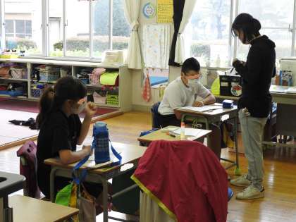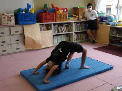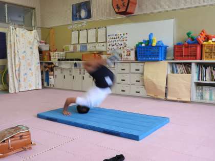 なかよし学級に行くと、二人の子どもたちが先生と国語の勉強をしていました。ほかの子どもたちは交流授業にいっていました。 個別の学習課題が終わったようだったので、他の教室へ移動しようとしたところ、子どもたちから校長先生に見せたいものがあるので見てほしいと言われました。 今日は何を披露(ひろう)してくれるのかな? 楽しみにしていると、マットを運び出し、マット運動を見せてくれました。 「すごいねぇ。」「校長先生もやりますか?」「いや、えんりょいたします………。」子どもたちの可能性は無限大ですね。