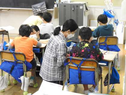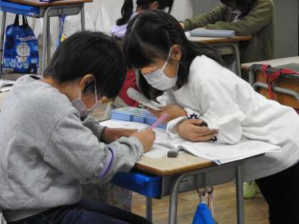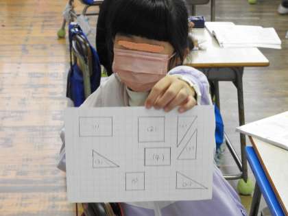 算数の授業で子どもたちが方眼用紙に図形を描いていきます。 以前も学校HPで紹介したことがありますが、小学生の頃、直定規や三角定規、コンパスで図形を描くことに強い興味関心があり、ひまがあるとノートに図形を描いていました。 「校長先生。上手に書けましたよ。」「本当だ。角もぴったりきれいに描けたね。」うれしそうにニコッと笑うと、近くにいた友だちから「きれいに描く方法を教えて」と頼まれ、スイッチティーチャーに変身していきました。