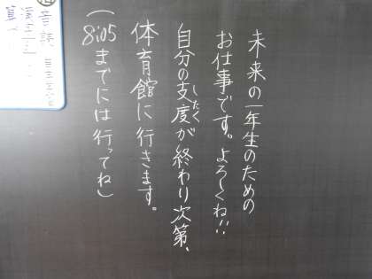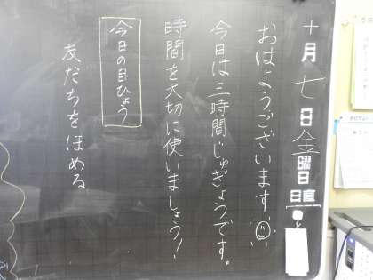 おはようございます。今日も1日寒いようなので、ベストを着用することにしました。疲れがたまっている金曜日だからこそ、周りの人の良さに気づき、光をあててほめてみませんか? 「あなたならできる。」私も長い人生の中で、たくさんの方々から色々な場面ではげまされ、応援され、支えられて成長してきました。 今日もリーダー6年生が未来の1年生のために大活躍です。 明日から三連休です。引き続き感染症予防対策・体調管理に努め、みんなで「鶴二小 運動会」を楽しみましょう! いってらっしゃい!
