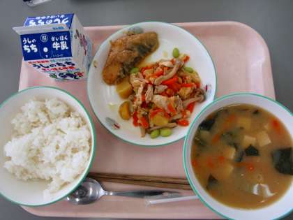 今日の献立は、ご飯、牛乳、さといものみそ汁、さばのごまみそソースかけ、ふきよせごはんの具でした。