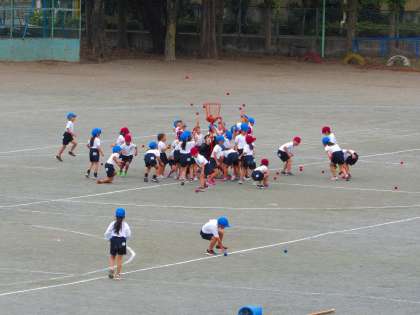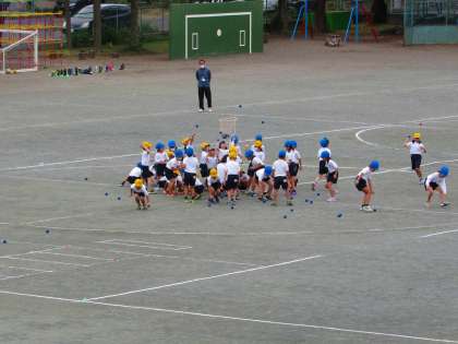 音楽に合わせて踊って、笛が鳴ったら玉入れゴー!