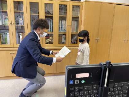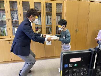 科学展と読書感想文の賞状が子どもたちに伝達されました。 廊下で待っていた子どもたちがとても緊張していました。「緊張するということは、一生懸命がんばろうとしている証拠。一生懸命はかっこいい。」子どもたちはもちろん自分にも言い聞かせて賞状伝達朝会にのぞみました。 賞状をもらった子どもたちも、仲間の頑張りを拍手でたたえる子どもたちも、とっても立派でした。とても素晴らしい週のスタートです。