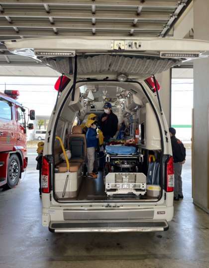 四つのグループに分かれて、消防署の秘密を探ります!実際に見る、消防車、救急車に子ども達の目が輝いています!