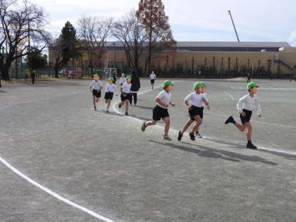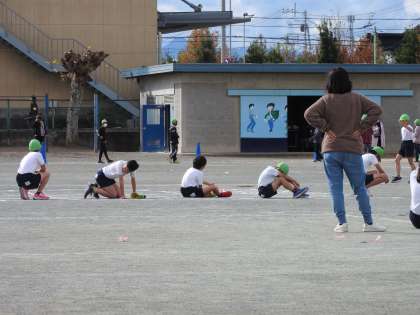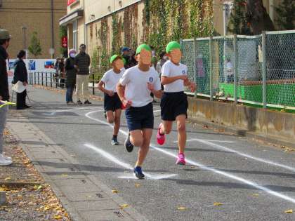 高学年ブロック:5年生男子のレースがスタートしました。 子どもたちが横を走っていくとき、風を感じました。 高学年の見学場所を2か所に設定しました。実は、子どもたちや先生方に知られないように、私もコースを実際に走ってみました。最もきつく感じたのが、公道の折り返しの場所と、校庭のゴール直前のカーブだということが分かったので、その2か所を移動しながら、子どもたちを応援しました。 ゴールし終わった後、順番カードをもらい、肩で息をしながら、地面に座り込む姿、本当にかっこよかったです。