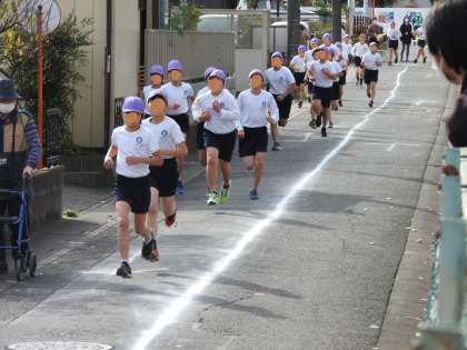 高学年ブロック:リーダー6年生の男子のレースがスタートしました。本日の持久走大会の最終レースです。 鶴二小の代表:リーダー6年生の走りは女の子も男の子も、本当に力強くたくましかったです。 4月の入学式の準備の時の出会いから、校外学習、運動会、修学旅行など、6年生の子どもたちと過ごした思い出が走馬灯のように頭の中を駆け巡りました。 私の声に負けないくらい、先生方、保護者・地域の皆さんが「一生懸命」な子どもたちに「一生懸命」応援してくださる姿に涙が止まりませんでした。鶴二小プライドを胸に、校庭が一体となって、たくさんの人々の一生懸命であふれていました。 「一生懸命はカッコイイ!」 鶴二小の子どもたちや先生方は私の誇りです。 6年生、ありがとう!!