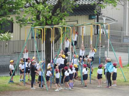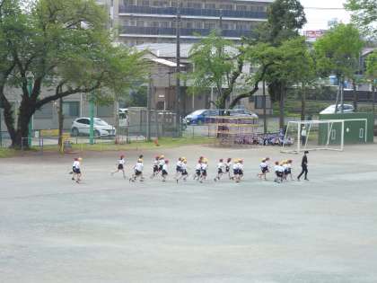 リトルリーダー2年生の体育の授業です。 先生方の授業計画がとてもていねいに練られていて、子どもたちへの説明も短く分かりやすく、子どもたちの活動時間がとても豊富です。 リトルリーダー2年生もとってもお話をしっかり聞くことができます。 体育の授業に行く前に、折り紙の得意な男の子が「セミ」を校長室まで届けてくれました。 男の子の作ったキラキラ輝くセミを見た子どもたちが「すごいね!」と叫びました。男の子もとてもうれしそうでした。 校長室の扉に「セミ」がいますので、ご来校の際は、ぜひ見てみてください。 担任の先生の後を付いていく子どもたちが、「カルガモさん」のようでかわいらしいです。
