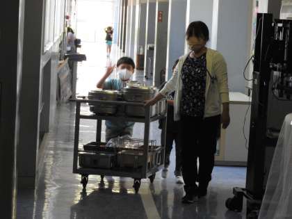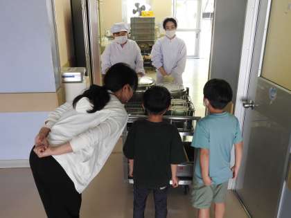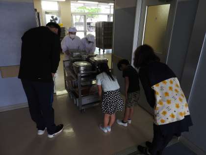 本日(19日)、1年生の参観日&懇談会にご来校くださりありがとうございました。画像は、本日の1年生の給食の片づけの様子です。 教室から配膳室まで先生方に寄りそわれ、しっかりと運ぶことができました。「1年〇組です。ごちうそうさまでした。」しっかりあいさつもできました。 よくできました!