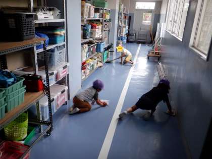 職員室〜校長室前の廊下は、普段は6年生と1年生が一緒に清掃しています。