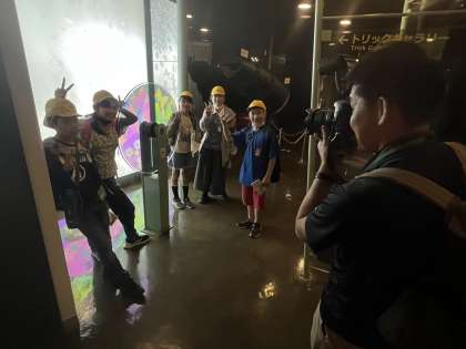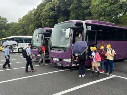 先生方、添乗員さん、カメラマンさん、運転手さんたちが連携を密にして、子どもたちを見守ります。 予定よりも15分ほど早く進んでいます。 帰路はお決まりの ジブリ作品 鑑賞のようです。