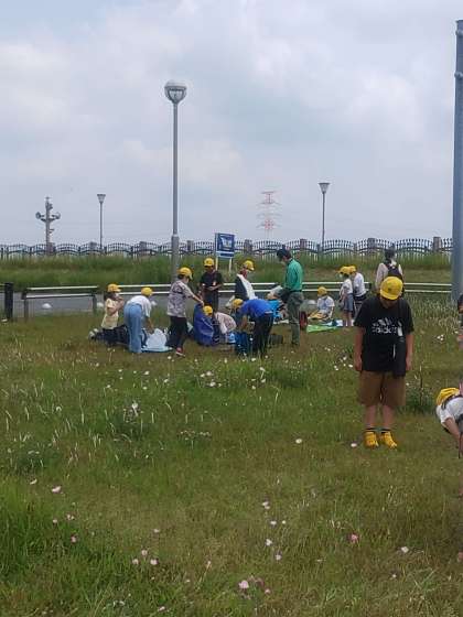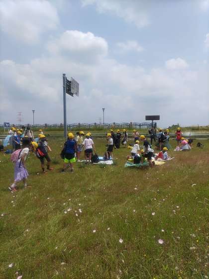 5年生は首都圏外郭放水路の敷地内で一足早くお昼です。