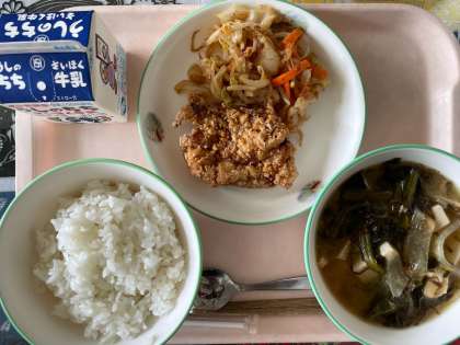 ごはん、牛乳、もずくの味噌汁、若鳥の唐揚げ、おかか和え、です。