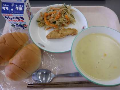 バターロール、コーンスープ、あじフリッター、ごぼうサラダ、牛乳です。