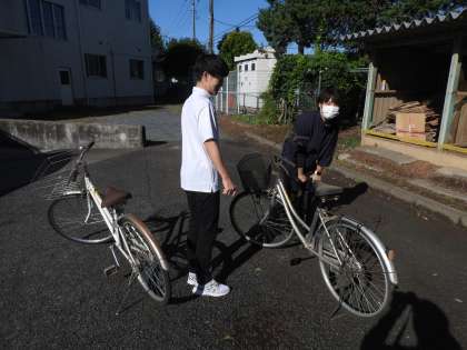 今朝は、登校見守りをしながら、南校舎の前の草刈りをしようと校長室を出ると、安全担当の先生方が交通安全教室の準備をしていました。 「タイヤの空気よし。自転車点検OK。」