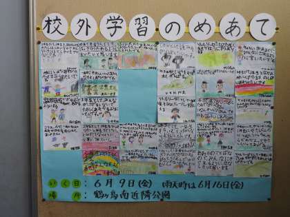 リトルリーダー2年生の学年掲示板に校外学習のめあて(見通し)が掲示されていました。先日行われた「鶴二小探検」では、2年生が1年生を引率して、鶴二小の校舎探検をしていました。 先生方・保護者・地域の方々からの「優しさのバトン」をたくさんいただいている鶴二っ子たちですから、「自分よりも幼いものへの優しさ」を日々育んでいます。