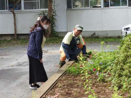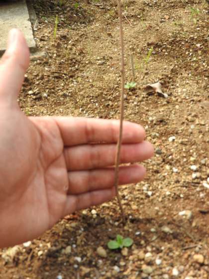 先日、子どもたちと「お菓子」についてお話しました。 好きなお菓子のお話になったときに「小枝」というお菓子があって、夏の暑さでドロドロに溶けてしまい、冷凍庫に入れて「小枝」から「太枝」にしておいしくいただいた思い出を子どもたちに話しました。 子どもたちから、「先生方の職員玄関へ続く階段のわきにある花壇から小枝が生えてきた。」との報告をもらい確認にいきました。 事務の先生と校務員さんとスクールサポートスタッフの先生が花壇をきれいにして、種をまいたところに、小枝の目印を立てたようです。 子どもたちの観察眼と発想力の豊かさに思わず笑みがこぼれました。 小枝の根元に小さな小さな芽が出ていました。 どのような美しい花が咲くのか、楽しみです。 鶴二小花いっぱいプロジェクト、進行中です。