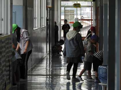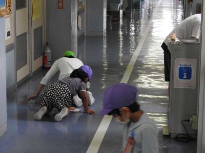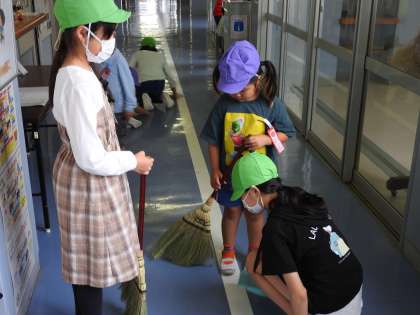 校長室前の廊下はトップリーダー6年生と1年生が、一生懸命そうじをしてくれています。 ぞうきんのしぼり方、ほうきのはき方、床のふき方……。6年生が優しく優しく教えます。たいへんなところは6年生が進んでやって、最後の仕上げのおいしいところを1年生にやらせてあげています。 たとえば、廊下の広い範囲を6年生がほうきではき、ゴミを一つに集め、最後にちりとりを持ってあげて、1年生にほうきを持たせ、「ちりとりにはき入れてごらん。」と優しく教えています。 1年生も最後の仕上げですから、一生懸命ほうきを動かします。 ゴミが無事にちりとりにおさまると、「今日もよくできたね。ほうきの使い方が前よりも上手になったね。」と1年生をほめていました。 ほめられた1年生もうれしそうにコクリとうなづきました。 鶴二小の伝統の「縦割り活動」が脈々と受け継がれていきます。