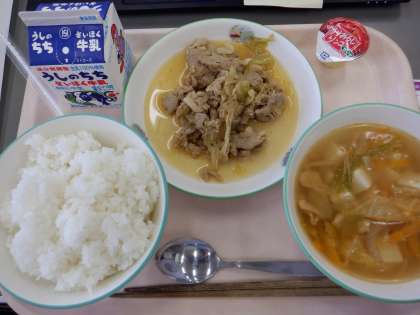 ごはん、牛乳、キムチスープ、おろし焼肉、ミニすりおろしリンゴゼリー でした。