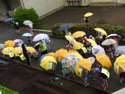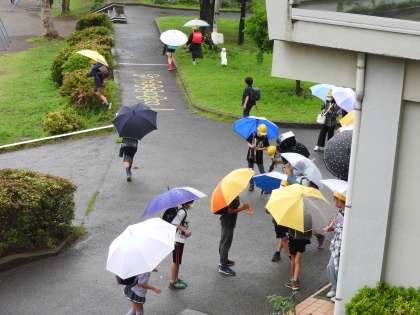 子ども達が帰宅します。 雨の日の楽しみは、子どもたちの雨ファッションです。 色とりどりの傘の花が咲きます。 「校長先生。見て見て。」と長靴をじまんしてくれる子どもたちもいます。 子どもたちの豊かな観察眼や感性から、雨の日の楽しみを教えられました。 また明日。元気で会おうね。
