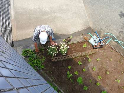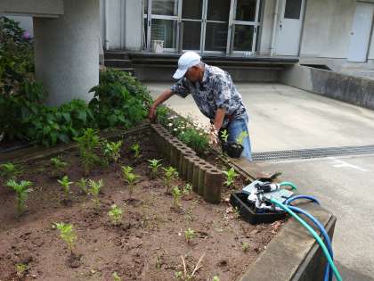 学校応援団さんと事務の先生が職員玄関への階段の左側にある花壇の前で何やら打ち合わせをしています。 「あの部分に〇〇の花の種をまきました。」 「あの部分には〇〇の花の苗を植えましょう。」 花が咲いたときのことをイメージして、みんなの力で花壇を創造していきます。 鶴二小花いっぱいプロジェクトが進んでいます。