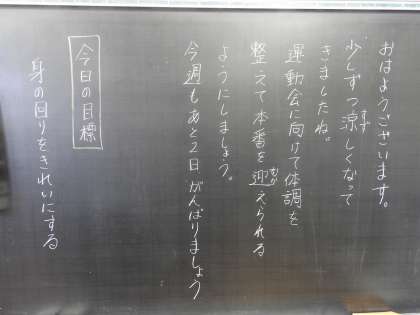 おはようございます! 昨日は子どもたちのために鶴ヶ島市の未来についての意見交換会、PTA本部会、PTA運営委員会でお世話になりました! 「すべては子どもたちのために」を合言葉に豊かな人が育つまち 鶴ヶ島市を築き続ける皆さんの熱い熱い想いに「闘志」がみなぎっています! 先生方、保護者&地域の皆さまが子どもたちの健康管理や感染症予防対策を講じてくださっているので、おかげさまで鶴二小の子どもたちも毎日、元気に学校生活をおくれています。本当にありがとうございます! PTA本部役員の皆さんと積極的に建設的な意見交換をして、「持続可能なPTA活動」を目ざしてブラッシュアップしていきます。 今日は鶴ヶ島市の市議会議員の皆さんが来校なされます。 鶴二っ子たちや先生方の一生懸命がんばる様子をご覧になっていただきたいと思います。 それでは、皆さんご唱和ください。「行くぞぉ〜! 1・2・3 鶴二小 一歩前へ!」 富士山が白い帽子をかぶり始めました。