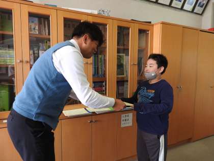 休み明けの日の楽しみの一つに「自主学習ノート」の受け取りがあります。 今日もなかよし学級の男の子とリトルリーダー2年生の男の子が、一生懸命、家庭学習に取り組んだ証である自主学習ノートを校長室に提出しにきました。「がんばったね。あれっ? この線は?」「校長先生。この線は0歳の妹が書きました。ハイハイできるようになりました。」男の子がうれしそうに妹さんの成長について教えてくれました。 「ノートのマスにみっちりていねいに字が書けましたね。この赤い字は?」「お家の人が書いてくれました。」 男の子の話では、お家の人が自主学習のアドバイスをしたり、終わると温かい言葉をかけてくれたり、コメントを書いてくださったりするとのこと。 「とってもありがたいですね。 そうそう、あなたの所属するスポーツチームの皆さんが校庭整備をしてくれましたね。コーチや保護者の皆さんに感謝です。」「校長先生。実は、僕もお手伝いしました。」「そうですか。どうもありがとう。おかげで、さらに安全な校庭になりました。」 そのような子どもたちとの交流を校長は楽しみにしています。