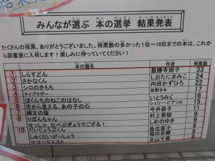 図書委員の子どもたちと図書室の先生と図書担当の先生が「本の選挙」を行い、結果が発表されました。 初めて目にする作品も多く、胸が躍りました。 私も借りようと思います。