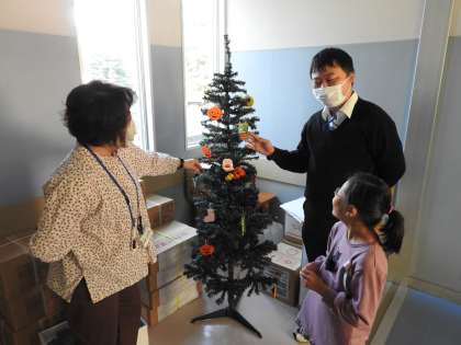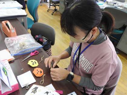 女の子が、毎朝、強い責任感をもって記録し続けている健康観察黒板(職員室の廊下にあります。)を書きに来ました。 「クリスマスツリーですか?」と女の子が事務室の先生方に話しかけていました。 女の子の背後から、そぉ〜っと近づいて「ハロウィン仕様のツリーだよぉ〜〜〜」(校長がイメージするおばけの声)で伝えました。 事務室の先生方も学級運営補助員の先生方も子どもたちを喜ばせようと色々なアイディアを教育活動に盛り込んでくださっています。 ありがとうございます。