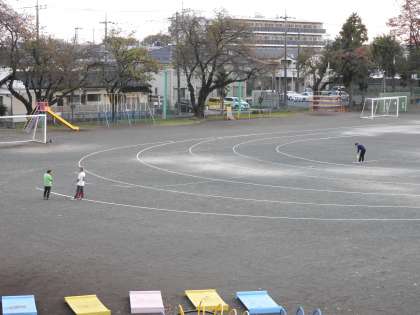 教務主任の先生と体育主任の先生が校庭にラインを引いています。明日から、持久走大会に向けて、子どもたちと一緒に走りたいと思います!