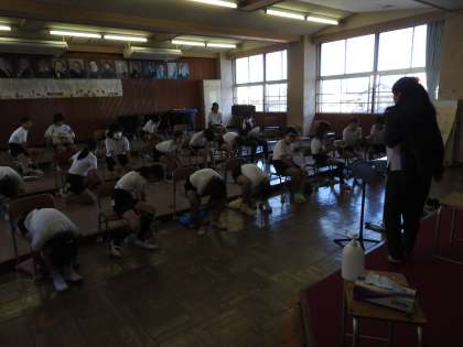 音楽室から職員室に戻って来られると、いつも鶴二っ子たちをほめてくださる音楽のレジェンド先生(鶴二小の元教頭先生でもあります)。 授業のおじゃまをしてはいけないと、いつも渡り廊下から授業の様子を見させていただいています。 元気に楽しそうに歌う子どもたちの表情もそうですが、何よりも、子どもたちの前で楽しそうに笑顔で授業をなさっているレジェンド先生に感謝と尊敬の気持ちがわきおこります。 合唱が終わると、オーケストラの動画を鑑賞していました。