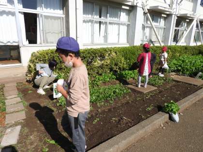 業間休み終了の予鈴(よれい)のチャイムが鳴りました。子どもたちも先生方も次の授業に向けて、校庭から校舎へ戻っていきました。 なかよし学級の子どもたちが、菜園で「こまつな」を収穫していました。 私がカメラをかまえると、男の子がスゥーっと、カメラのフレームから消えました。 「どうしたのかな?」 校長室に戻って、ホームページを更新していると、さきほどの男の子が「袋いっぱいのこまつな」を届けてくれました。 「校長先生。どうぞ!」「どうもありがとう!」(なるほど、お楽しみは、後でなのか。) 今晩、おひたしにしておいしくいただく予定です。