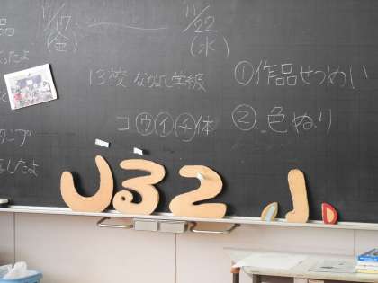 世の中のデジタル化が進み、学校だよりをはじめとする様々な文書がPC(ワープロソフト)を使って作成される時代となりました。 なかよし学級の子どもたちが、作品展のための準備をしている場面におじゃましました。 子どもたちから、「校長先生。黒板の前にある木の文字作品の書体は何体でしょうか?」と質問されました。「ヒントをください。」「明朝体やゴシック体ではありません。」(この子たちはよく書体の名前を知っているなぁ。私が小学生の時は知らなかったぞ。)「ウ〜ム。難しくて、お腹がイ体(痛い)ですかね?」子どもたちが大笑いしながら、「校長先生。オヤジギャグはいけませんよ。」(優しい。子どもたちです。)「ヒントは、コ〇〇〇体です。」「このクラスの子どもの名前です。」「でも、コが名前の付く子は何人かいますよねぇ。さて、どなたでしょう?」 子どもたちが、思い思いの言葉でヒントを出してくれました。 「あぁ、分かりましたよ!」 デザイン力の才能をもつ子がデザインした文字を、学級運営補助員の先生がノコギリを使って木の板から切り出してくだったとのこと。 子どもたちの才能や可能性は本当にすばらしいなぁと感じました。