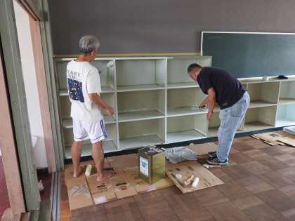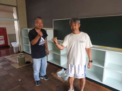 近い未来、この教室を使うことになるであろう、子どもたちや先生方のために、環境整備をします! 教務主任の先生とスクールサポートスタッフの先生が、ペンキを塗り始めました。 私は、天井からぶら下がっていたOHP(オーバーヘッドプロジェクター:昔の時代の拡大投影機のことです。)専用の古いスクリーンをはしごに登って取り除きました。 長い間、物置として使われていた教室を毎日少しずつ時間を作ってリノベートしていきます。 ベランダへの扉も、教頭先生が業者さんにお願いして修繕していただきました。 鶴二小の価値を高めるため、未来の鶴二っ子たちや先生方のため、「今 鶴二小改造計画」を頑張ります。