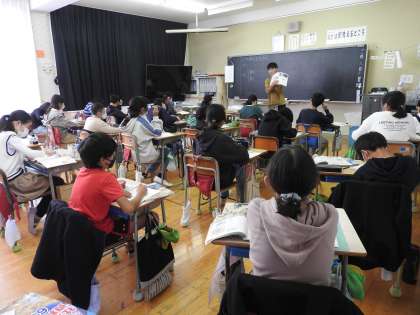 6年生の先生が、子どもたちに「教科書の商人のイラストの商人が持っているものは何だと思いますか?」と質問しました。 座席の近い子どもたちが、絵を見て自分の意見を交流させていました。「校長先生は、何だと思いますか?」 私は老眼でよく見えなく、タブレットのように見えたので、「タブレットでしょうか?」と伝えると、「校長先生。江戸時代にタブレットPCはありえないですよ。」と言われました。「みんなは、何だと思いますか?」と聞き返すと、「帳面(ノート)」や「そろばん」という答えが返ってきました。