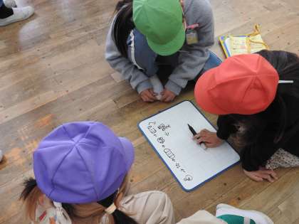 お店の番をする子どもたちが、「前半」と「後半」に分かれて、「楽しむ子どもたち(お客さん)」と「楽しませる子どもたち(お店屋さん)」の役割を交換します。 さらに、呼び込みをする子。受付をする子。説明をする子。遊びに付き添う子。得点を記録する子……などなど、各グループによって子どもたちが自分の役割や係分担に強い自覚と責任をもって楽しんでいました。